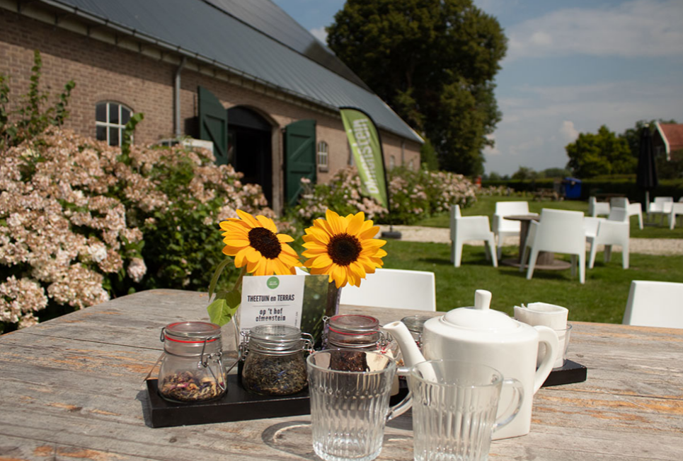 Op ’t hof Olmenstein ligt midden in de natuur. Je kunt er mooie wandelingen maken. Ook ligt het aan de fietsknooproute, dus een stop bij de theetuin is snel gemaakt!